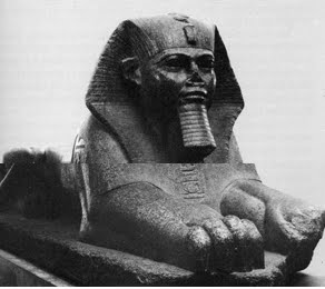 FIGURA 5 - Esfinge de Hatshepsut em pedra calcária pintada (1470 a.C.). À direita: Esfinge de Ammenemes II em granito vermelho/ 1900 a.C. Imagem que demonstra a diferença entre a suavidade e a feminilidade emergente dos traços da esfinge de Hatshepsut das feições destacadas pela esfinge de Ammenemes II.