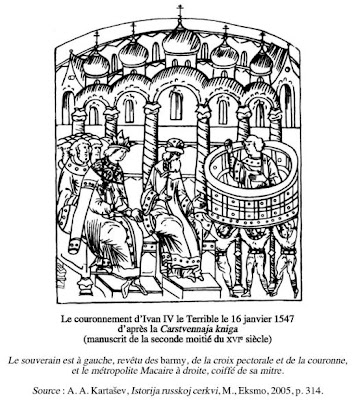 Na sequência, e mais particularmente na procissão solene da coroação da maioria dos cristãos vê a expressão de tal rito. Você pode dizer o mesmo sobre a coroação dos czares, especialmente quando o soberano, a chamada de celebrantes, as cabeças solenemente para o santuário após oPÔR CARSKIJ " para receber a unção: o monarca está respondendo aos seus " vocação "(PRIZVANIE) literalmente, simbolicamente, como avançar em direção à parte da igreja (ALTAR "), que simboliza a Jerusalém celeste, o "lugar santo" (SVJATOE ŽILIŠČE) mencionados na oração da imposição das mãos .